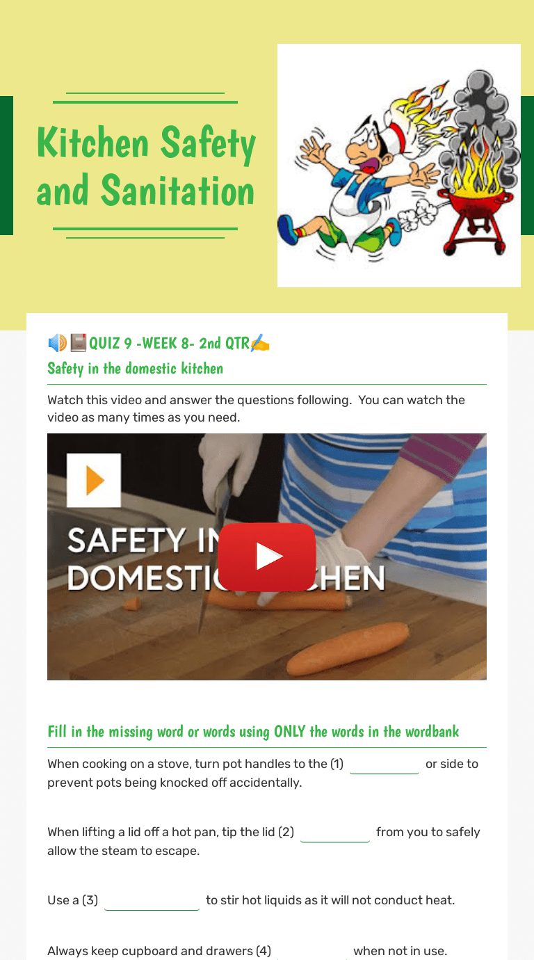 In the space above the picture . That will help students understand and learn the dangers when . Watch this video and answer the questions following. Safety in the domestic kitchen. Learn vocabulary, terms, and more with flashcards, games, and other study tools.