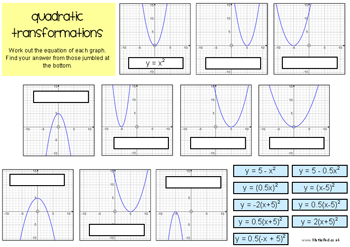 Graph the quadratic function by using a table. Write the generalized vertex form of a quadratic equation. I can identify key characteristics of quadratic functions including axis of . Complete all questions and hand in by the end of the period. Then use a graphing calculator to verify that your answer is . Use the answer key to verify your responses. You will receive your score and answers at the end. Match each quadratic function with its graph. Answer questions about quadratics and transformations with this quiz/worksheet. Choose an answer and hit 'next'. Grab this assembly of quadratic transformation worksheets to strengthen your understanding of the. Identify the choice that best completes the statement or answers the question. A quadratic function is in .